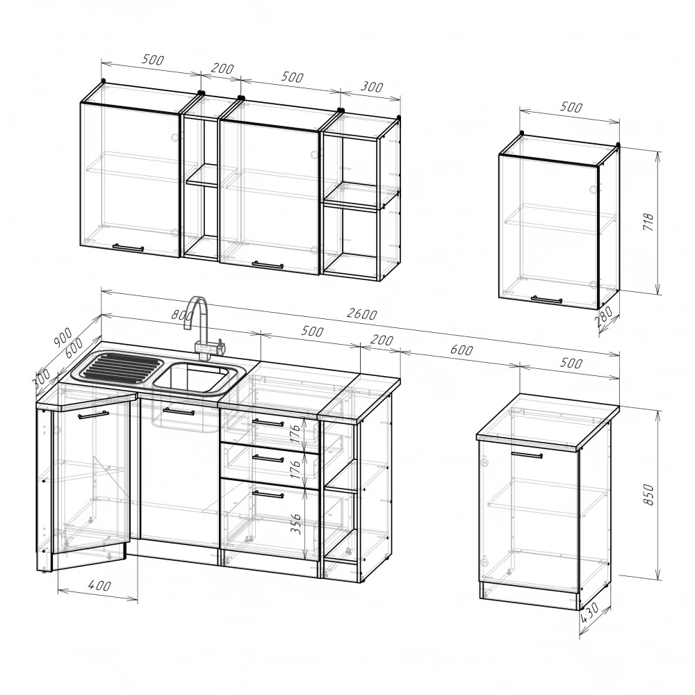 Мойки, смесители и посудосушители в комплекты гарнитуров не входят.