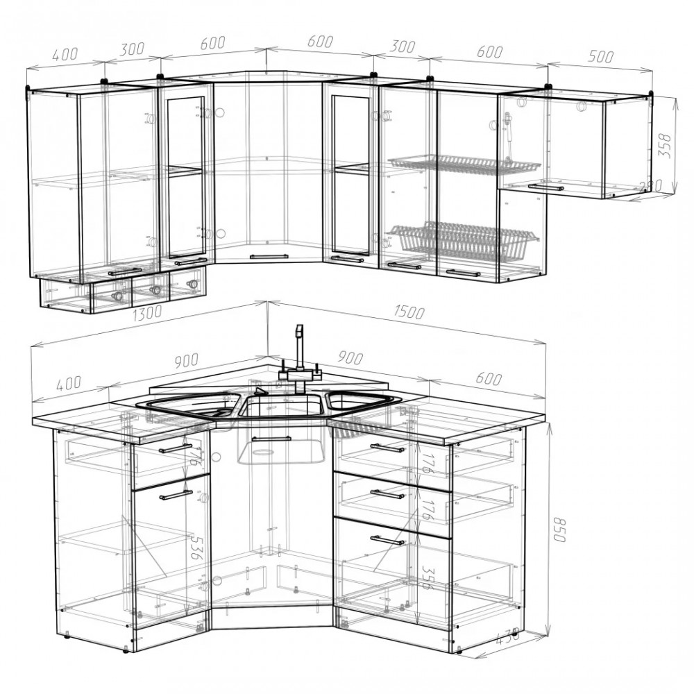 Мойки, смесители и посудосушители в комплекты гарнитуров не входят.