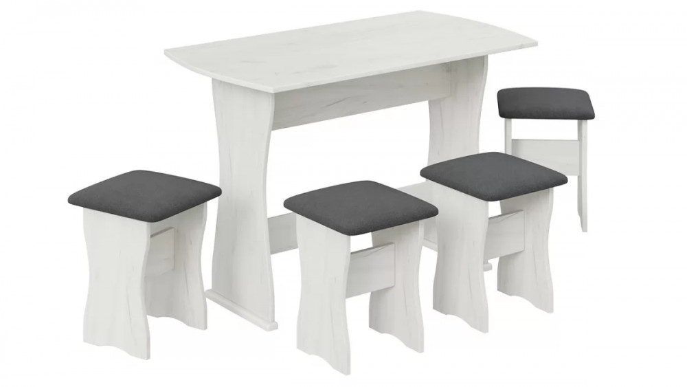 Назначение: Мебель для работы и приема пищи Гарантийный срок: 18 месяцев Комната использования: Кухня Стиль: Современный Габаритная длина: 1 100 Тип: Обеденная группа Расположение: Напольный Материал каркаса: ЛДСП Размеры стола: 1100х600х760 Дополнительная информация: Комплектация : стол + 4 табурета, материал мягкого сидения - кожзам. Производство: Россия Габаритная ширина: 600 Габаритная высота: 760 Размеры табуретов: 340х340х430 Срок службы: 5 лет Оттенок: Платиновый, Серый Цвет: Дуб крафт белый/Велюр серый Обивочный материал: Велюр Цвет каркаса: Дуб крафт белый Оттенок каркаса: Платиновый Оттенок обивки: Серый Цвет обивки: Велюр серый Материал столешницы: ЛДСП Заглушина для ящика кровати в комплекте: Нет Наличие механизма раскладки: Нет Наличие спального места: Нет