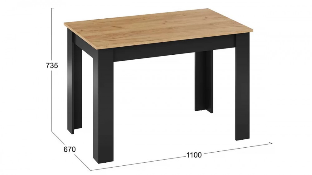 Механизм трансформации: Нет Назначение: Мебель для работы и приема пищи Гарантийный срок: 24 месяца Комната использования: Кухня, Гостиная Стиль: Современный Габаритная длина: 1 100 Тип: Стол Расположение: Напольный Материал ножек/опоры: ЛДСП Материал подстолья: ЛДСП Дополнительная информация: Расстояние между опорами по длине стола - 915 мм, по ширине - 517 мм. Производство: Россия Габаритная ширина: 670 Габаритная высота: 735 Форма предмета: Прямоугольный Модель: Промо тип 2 Срок службы: 5 лет Цвет: Черный, Дуб Крафт золотой Материал столешницы: ЛДСП Материал кромки столешницы: ПВХ Материал кромки подстолья: ПВХ Материал кромки ножек/опоры: ПВХ Наличие механизма раскладки: Нет Количество опор: 4 Наличие спального места: Нет