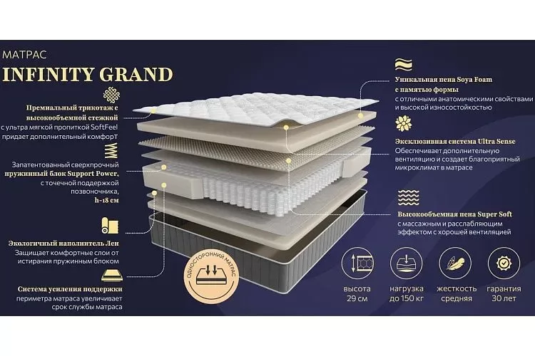 Матрас INFINITY GRAND 1400*2000мм (Пена/лен, ср.жесткий, h 29см)