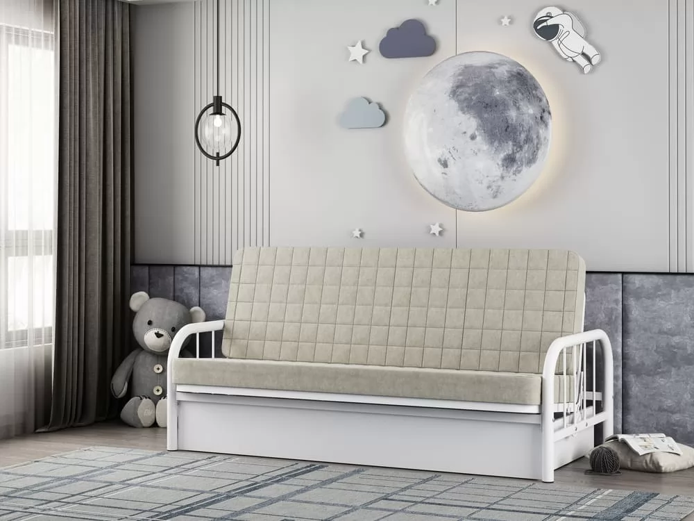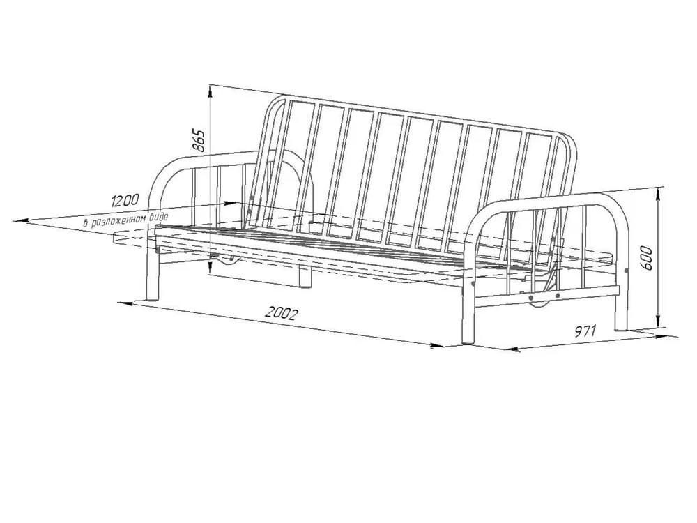 Материал: каркас — сталь, стойки боковины (труба) Ø51, основная труба лежака 40х20 мм, чехол дивана — ткань (велюр, стеганный на 100 гр холконе). Механизм разложения дивана: трехпозиционная книжка. Размер спального места, см: 120х190. Допустимая нагрузка на спальное место: 180 кг. Высота: 87 см Ширина: 200 см Глубина: 97 см Вес упаковки: 73 кг Объем упаковки: 0.526 м3