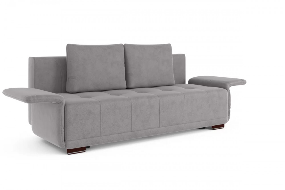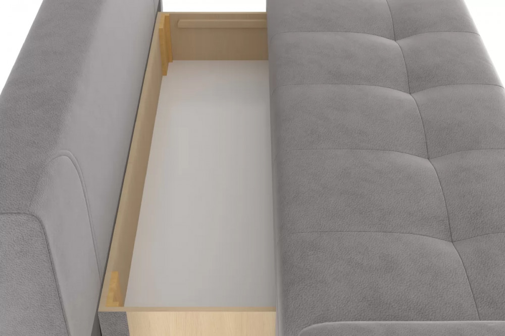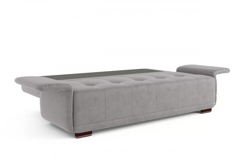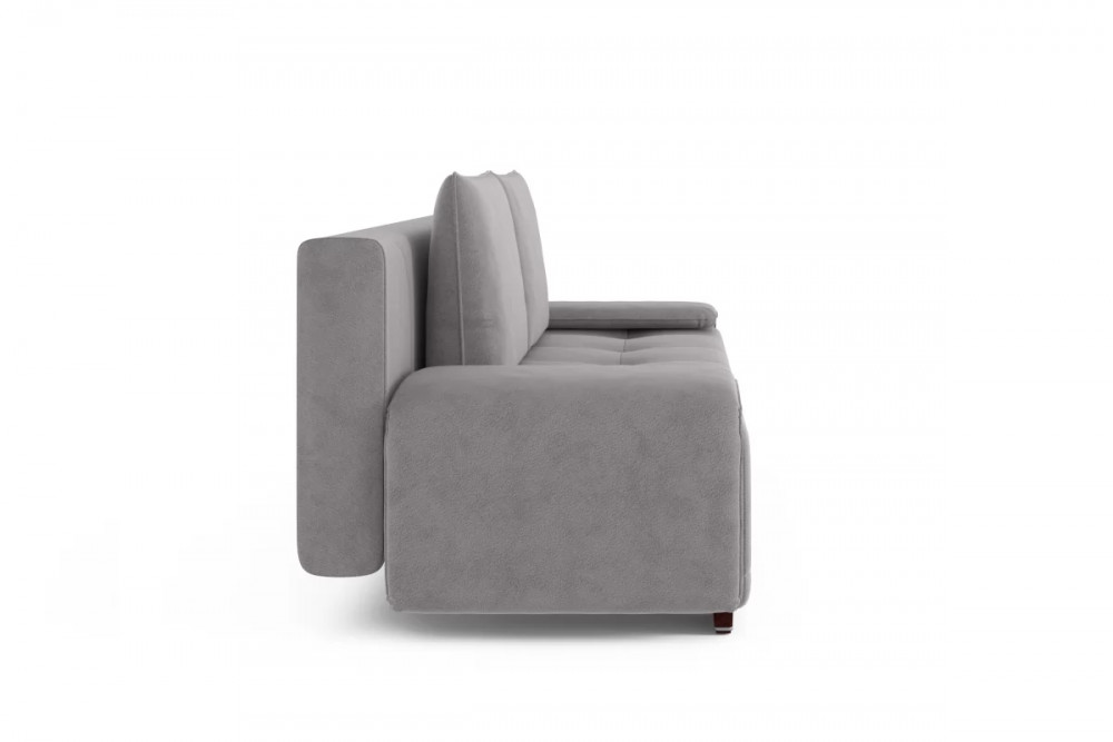 Оригинальный подлокотник с механизмом трансформации уменьшают габариты дивана в сложенном ввиде и организуют рабочцю поверхность в сложенном ввиде.