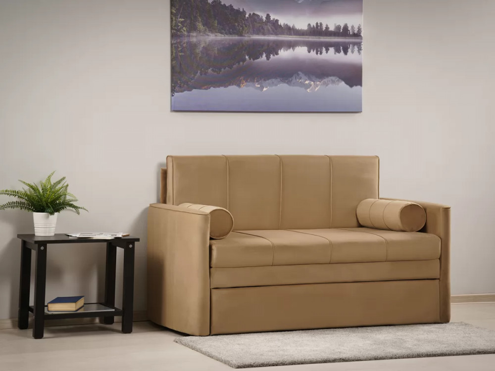 Габаритысложенный (Д x Г х В, мм): 1450 x 800 x 840разложенный (Д x Г х В, мм): 1450 x 2000 x 770спальное место (Д x Ш, мм): 1950 x 1200высота посадки (мм): 460глубина сиденья (мм): 650высота спинки (мм): 450высота подлокотника от сиденья (мм): 120максимально допустимая нагрузка: 80 кгМеханизм трансформацииВыкатной с гнутоклееными латамиБельевой ящикестьодно отделениеразмер отделения (Д x Ш, мм): 1100 x 628 x 100Варианты исполнения6 артикуловсочетание тканей только как на фотоМатериалыосновная ткань: Киви (велюр) / Макс (велюр)выполняется в тканях: Макс 210 (песочный)каркас: фанера деревянный брус ДСП ДВП ЛДСПоснование матраса: ППУ на основании из гнутоклееных латдекоративные подушки, шт: 2наполнитель подушек: полиэфирное волокно «шарики»материал опор: пластикцвет опор: черныйвысота опор (мм): 25ДекорНа фронтальной части спинки дивана прострочены защипы (3 шт.). По торцам втачен кант. На декоративных валиках прострочены защипы -2 шт. и защип вдоль круглого торца. Сидение имеет 3 защипа. Верхний торец подлокотников полукруглый, на ребре полукруга втачен кант.Назначениев молодежную в детскую в гостевую комнатуТребуется ли сборкадаУпаковкаколичество коробок, шт: 1общий вес с упаковкой, кг: 56,6Гарантия: 18 месяцев