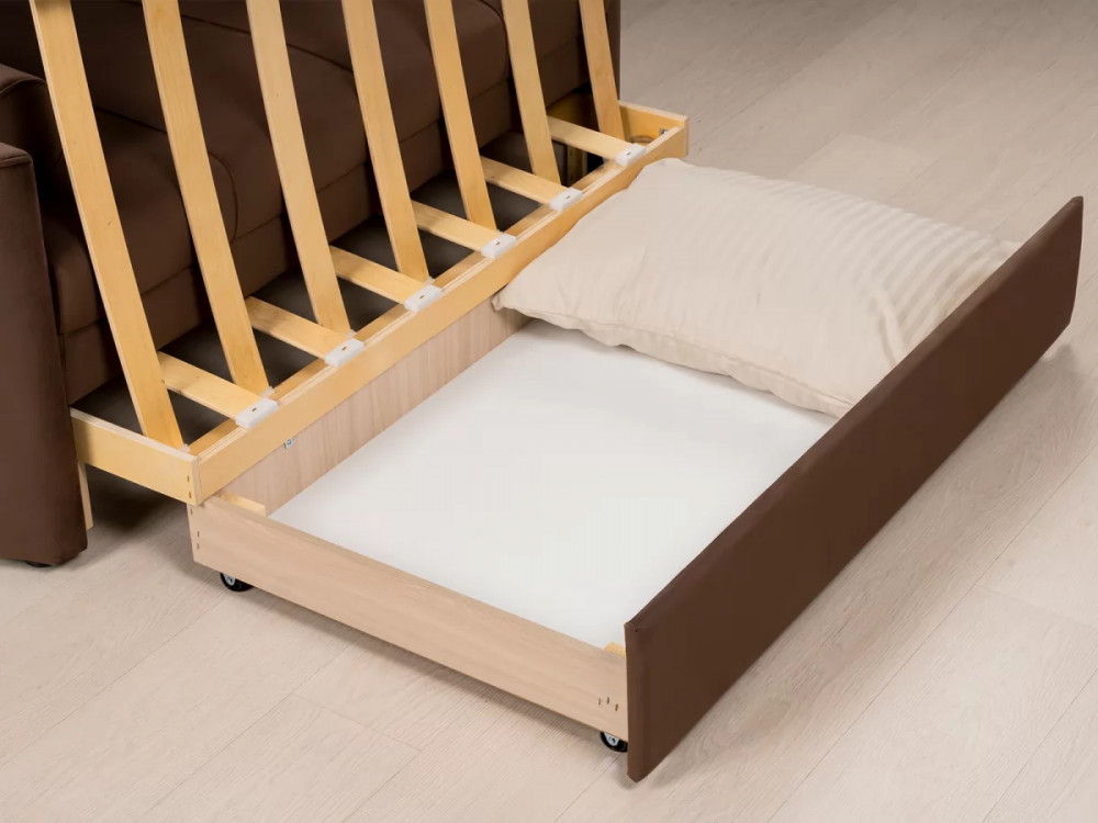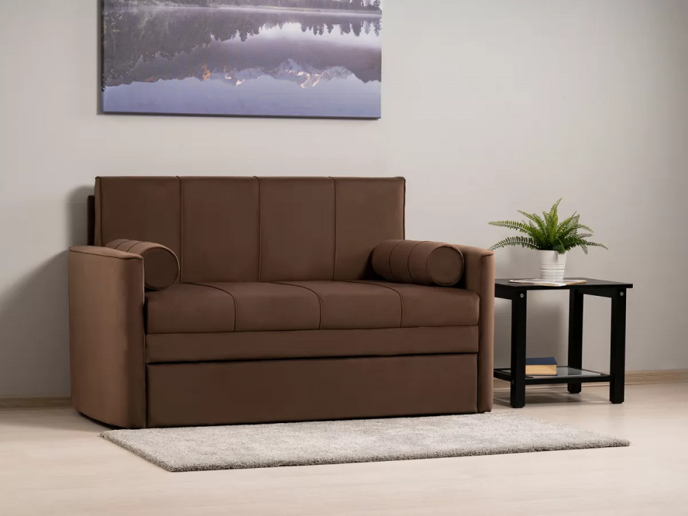 Габаритысложенный (Д x Г х В, мм): 1450 x 800 x 840разложенный (Д x Г х В, мм): 1450 x 2000 x 770спальное место (Д x Ш, мм): 1950 x 1200высота посадки (мм): 460глубина сиденья (мм): 650высота спинки (мм): 450высота подлокотника от сиденья (мм): 120максимально допустимая нагрузка: 80 кгМеханизм трансформацииВыкатной с гнутоклееными латамиБельевой ящикестьодно отделениеразмер отделения (Д x Ш, мм):  1100 x 628 x 100Варианты исполнения6 артикуловсочетание тканей только как на фотоМатериалыосновная ткань: Киви (велюр) / Макс (велюр)выполняется в тканях: Макс 235 (коричневый)каркас: