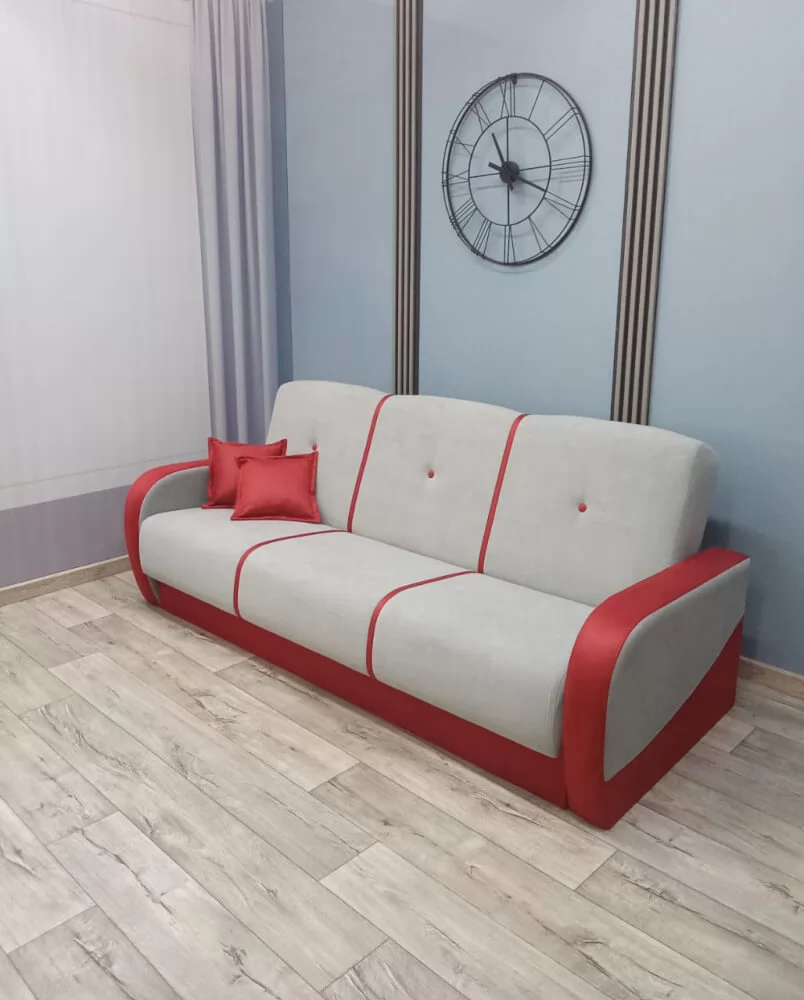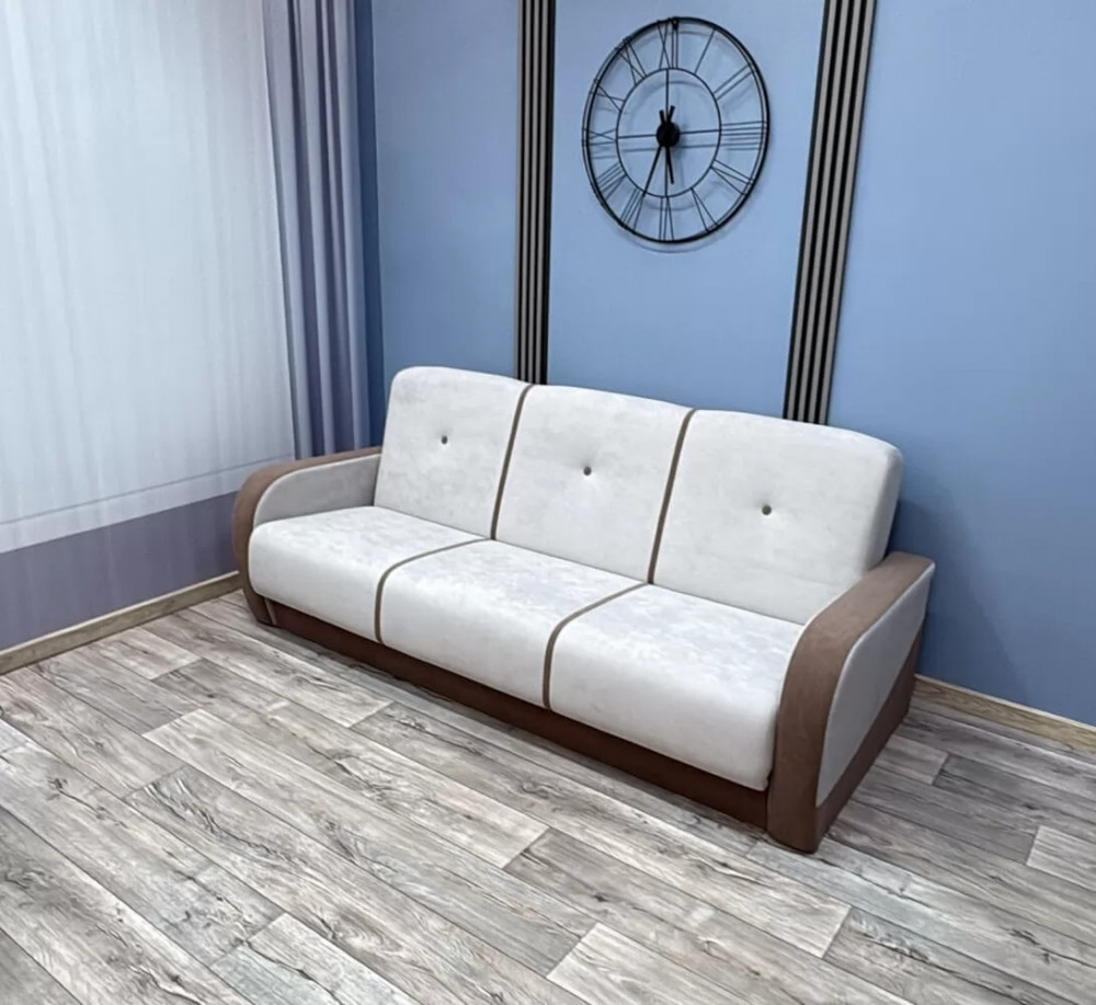 Это лучший вариант соотношения «цена-качество». Спальное место дивана основано на пружинных блоках, соединенных между собой механизмом раскладки «Книжка». Имеется вместительный короб для бельевых принадлежностей. Съемные подлокотники упрощают процесс транспортировки.