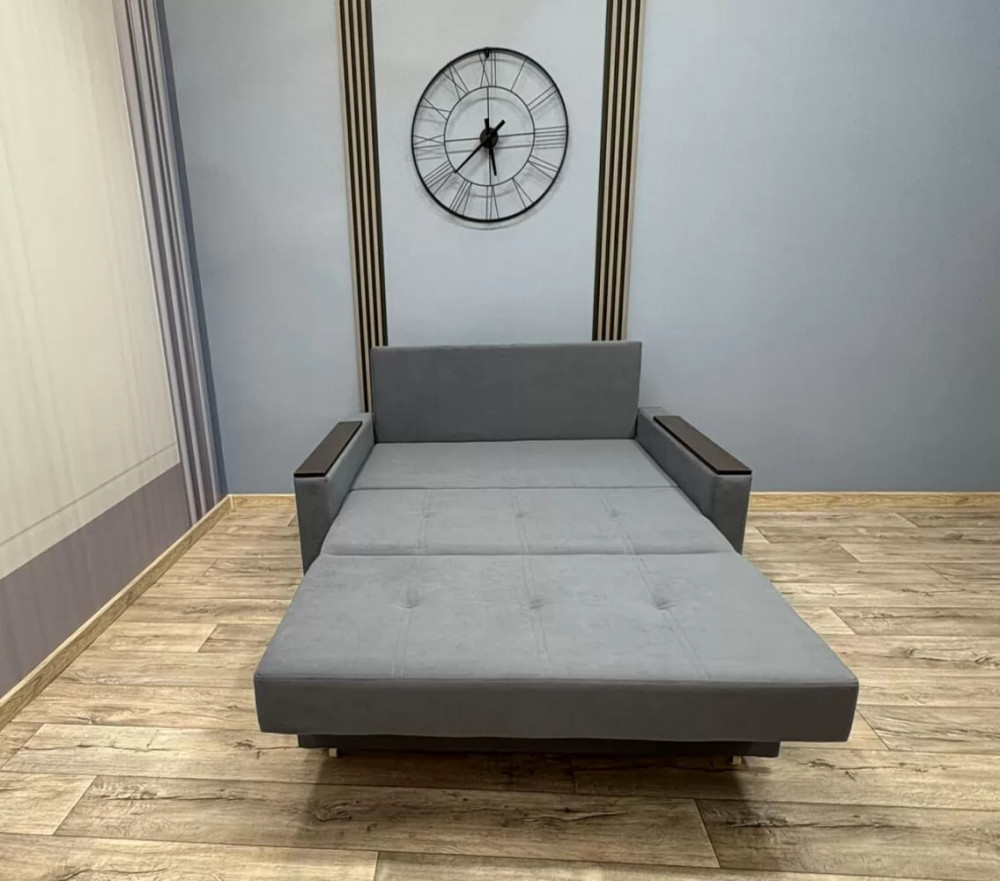 Каркас – древесина хвойных пород Способ раскладки – "Аккордеон" Бельевой короб - ЛДСП Подлокотники - съемные Спинка – ППУ высокой плотности высотой 90 мм Сиденье – ППУ высокой плотности высотой 90 мм Обивка – под заказ Опоры – пластиковые изделия Габариты – 1440*1060*900мм Спальное место – 1200*1950мм Объем – 1,3м3