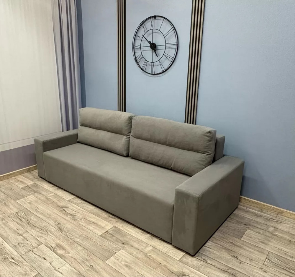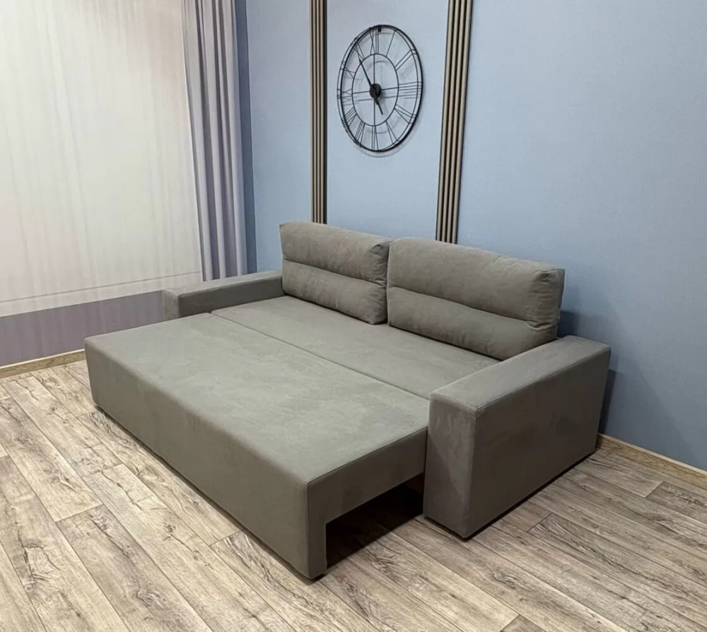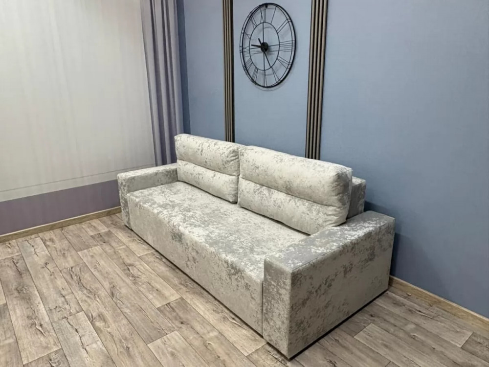 Каркас - древесина хвойных пород Способ раскладки –«Евро-книжка» Подушки - гипоаллергенный "Микс" Спинка, сиденье - независимый пружинный блок 120 мм, ППУ высокой плотности 30 мм Бельевой короб - ЛДСП Обивка - под заказ Опоры - пластиковые элементы Габариты - 2220*1000*900мм Спальное место - 2000*1600мм
