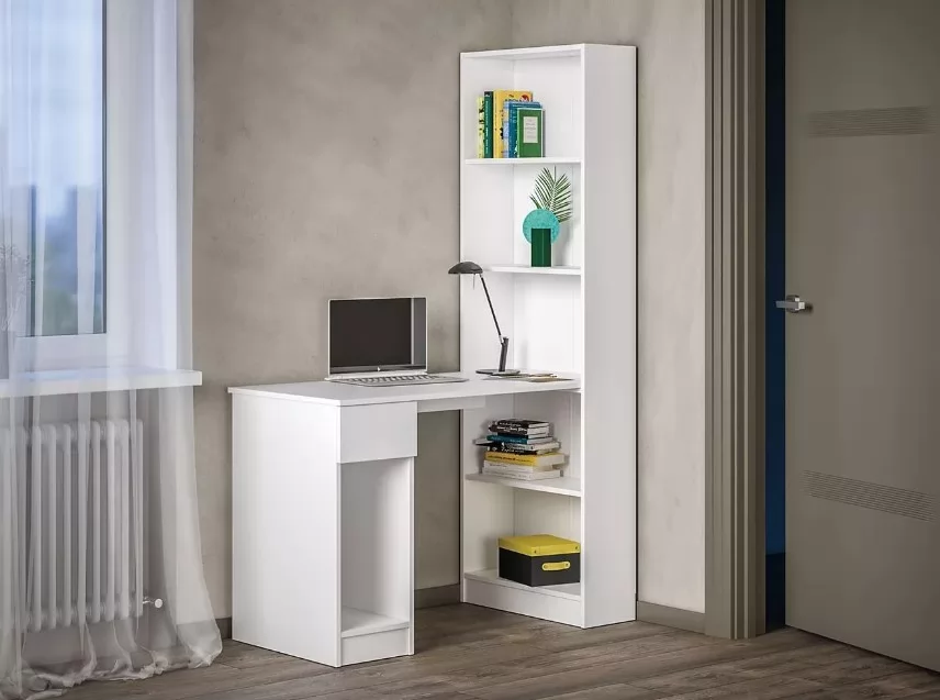 Модель объединяет в себе письменный стол и шкаф-стеллаж с четырьмя полками.