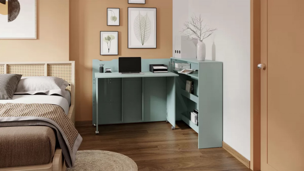 В сложенном состоянии он почти не занимает места, а в разложенном виде — это полноценное рабочее место с секциями для хранения документов, канцтоваров и прочих мелочей.