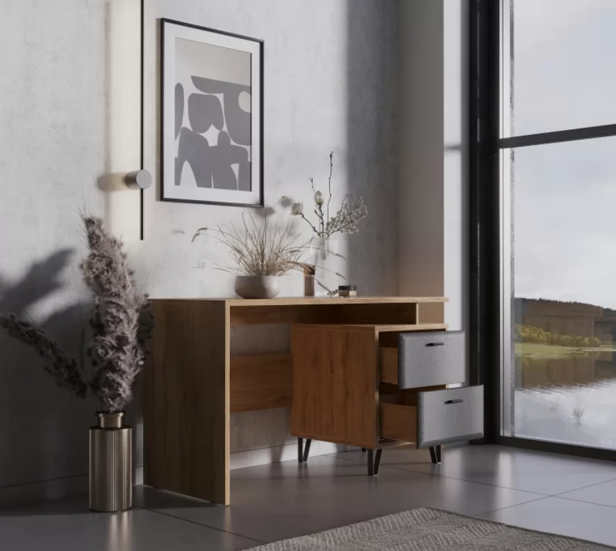 Стол стоит на металлических ножках, что гарантирует устойчивость конструкции. Лаконичный фасад ящиков и металлические ручки сделают эту часть интерьера центральным элементом комнаты.