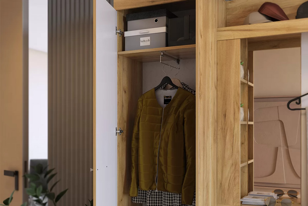 Состоит из крючки для одежды, обувницы, открытой ниши для обуви, открытых полок, зеркала, полки для головных уборов, выдвижного ящика, шкафа для одежды.