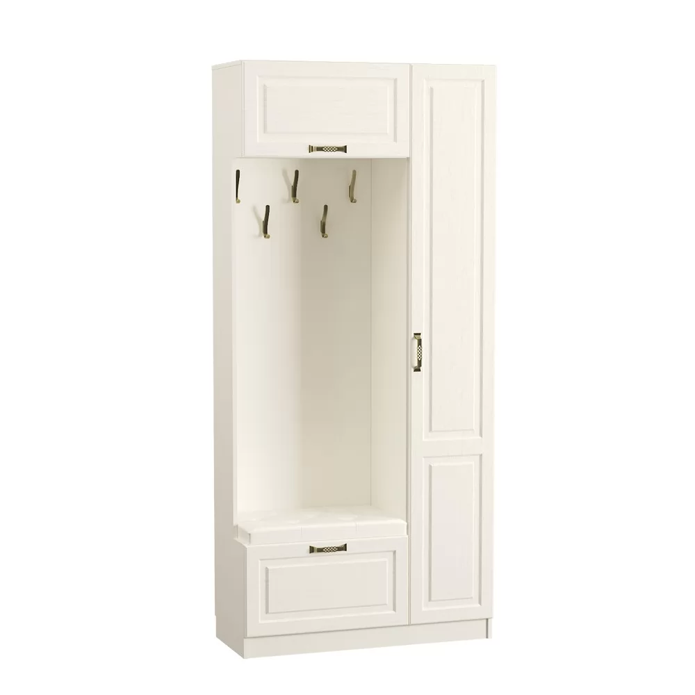 Шкаф для прихожей "Ливерпуль" №13.21 состоит из открытой ниши с крючками для верхней одежды, закрытого вертикального блока с полками и двух ящиков для хранения необходимых предметов. Верхний ящик оснащен откидной дверцей, а нижний имеет выдвижной механизм. Поверхность нижнего ящика оборудована мягким элементом, на который можно присесть для переобувания.