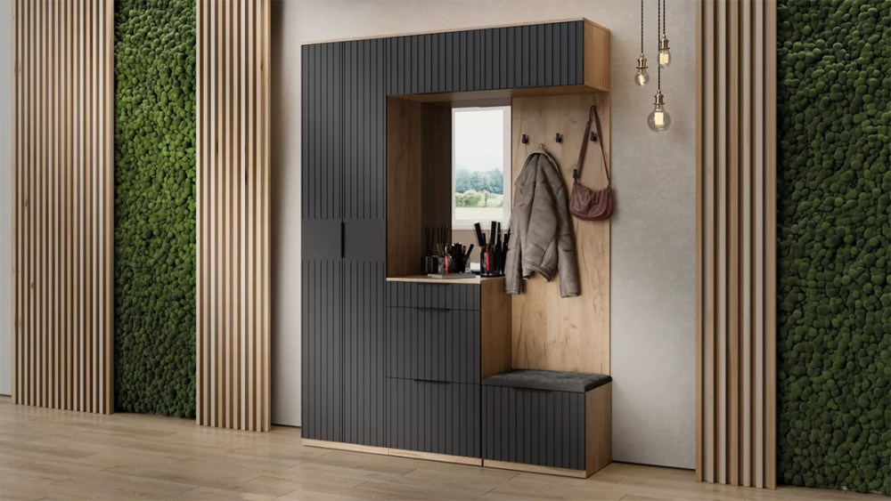 Назначение: Мебель для хранения Зеркало: Да Гарантийный срок: 24 месяца Комната использования: Прихожая Материал кромки каркаса: ПВХ Стиль: Современный Тип: Гарнитур в прихожую Расположение: Настенный, Напольный Наполнение: Полки ЛДСП, штанга, ящик Материал каркаса: ЛДСП Материал ручек: Металл Производство: Россия Габаритная ширина: 1 900 Габаритная высота: 2 260 Форма предмета: Прямоугольный Габаритная глубина: 428 Модель: Хилтон (прихожая) Срок службы: 5 лет Материал фасада: Оттенок: Коричневый, Серый Цвет: Дуб Крафт золотой, Графит матовый Цвет каркаса: Дуб Крафт золотой Цвет фасада: Графит матовый Оттенок каркаса: Коричневый Оттенок фасада: Серый Тип сборки: Универсальный левый/правый Наличие механизма раскладки: Нет Наличие спального места: Нет