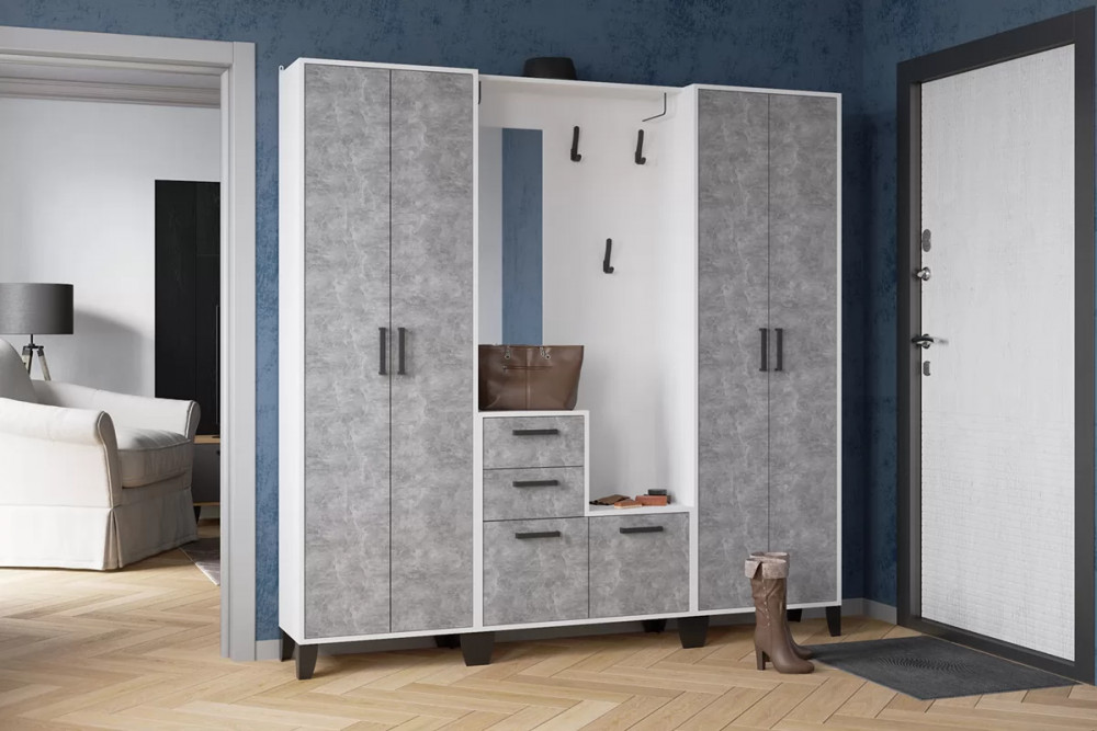 Фурнитура: роликовые направляющие, опора металлическая матовая, черная. Ручки пластиковые, черные. Крючки пластиковые, черные, покрытие soft-touch. Сборка центральной секции НЕ универсальная (как на фото).