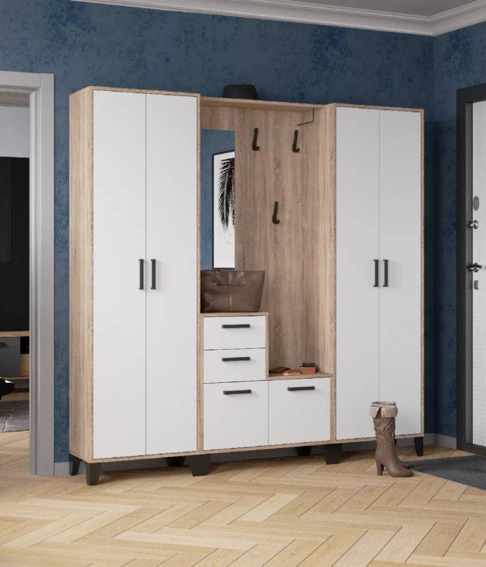 Высота, мм: 2000 Ширина, мм: 1400 Глубина, мм: 340 Материал корпуса: ЛДСП Материал фасада: ЛДСП, зеркало Цвет корпуса: Дуб крафт золотой Цвет фасада: Белый Цвет ручки: Черный Материал ручки: Пластик Расположение: Универсальное Количество зеркал: 1 Количество ящиков: 4 Количество дверей: 4 Количество крючков: 3