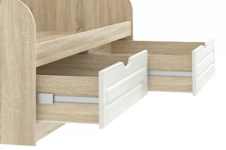 Тумба Оливия НМ 040.45 Х обеспечит аккуратное хранение обуви в прихожей. Для этого лучше всего подойдет нижнее отделение с полкой, скрытое за откидным фасадом. За счет встроенных газлифтов дверца открывается плавно. В верхней части тумба оборудована двумя выдвижными ящиками, в которых можно хранить средства по уходу за обувью, ключи.