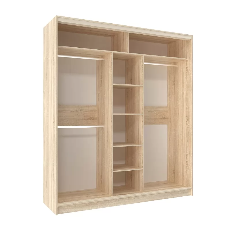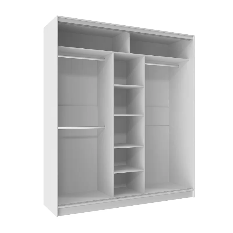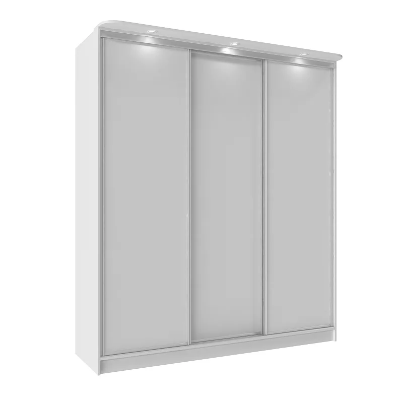 В шкафу-купе шириной 2 м найдется место для гардероба всей семьи. Разместите в нем бельё, верхнюю одежду, головные уборы и саквояж. Продуманное внутреннее наполнение, состоящее из трёх стационарных штанг и полок для белья, позволяет зонировать хранение одежды каждого члена семьи. Благодаря разделению фасада на три двери, доставать вещи очень легко. В комплектацию входит шлегель - щётки с толстым ворсом, которые устанавливаются на профиль дверей шкафа-купе и приглушают удары дверей при закрывании, а также способствуют пыленепроницаемости. На скрытых полкодержателях Titus полки шкафов-купе крепятся жестко. Возможна регулировка полок по высоте. В шкафу-купе используется стальная система "Найди". Применяемый в ее изготовлении металл обеспечивает мебели необходимую прочность и долговечность. По краю дверей шкафа-купе защитная пленка препятствует повреждению красочного слоя металлического профиля. После установки шкафа ее можно удалить.