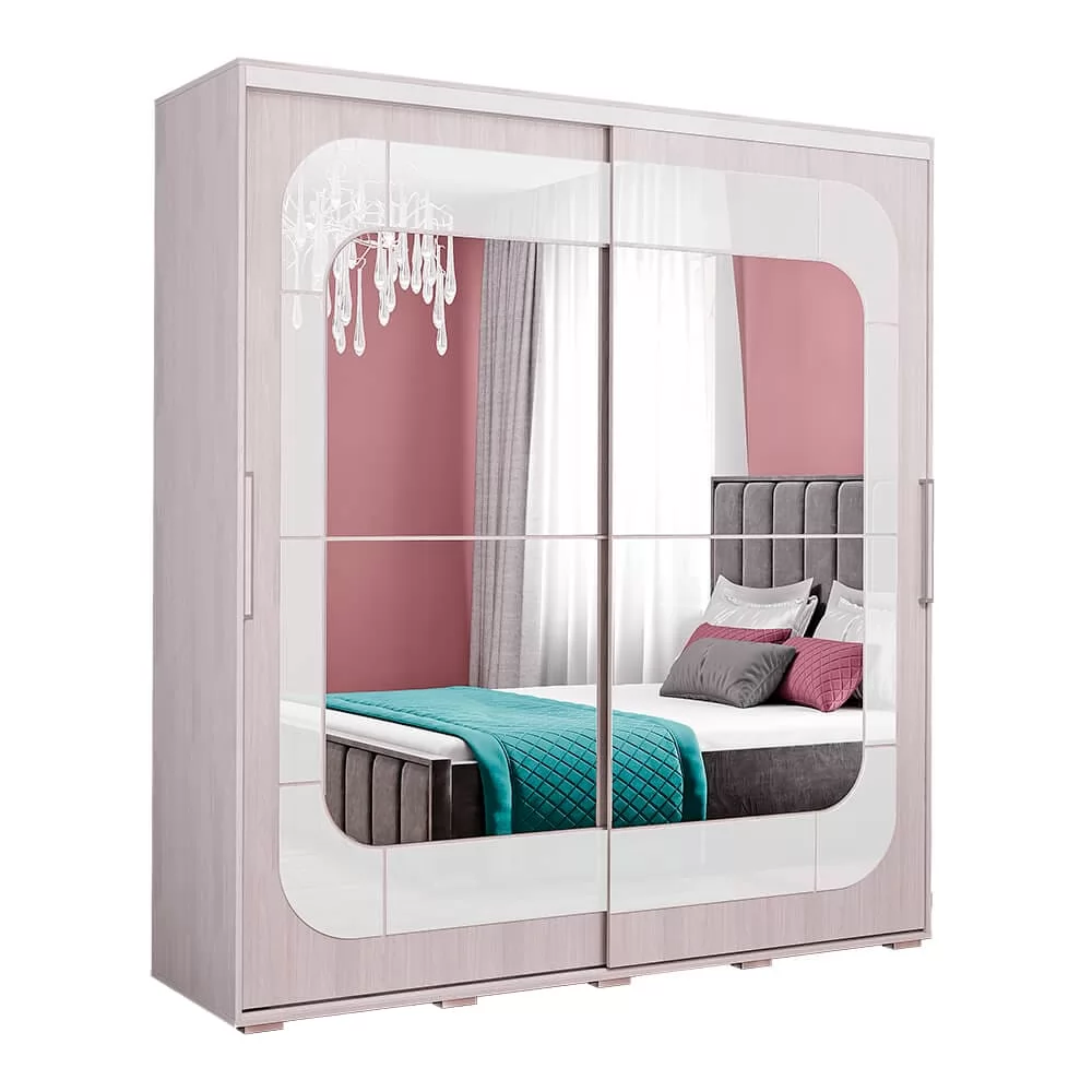 - модель изготовлена из ЛДСП в цвете белый ясень, - раздвижные створки декорированы зеркалом и стеклом - такой прием облегчает конструкцию и позволяет расширить пространство, - внутри модель состоит из многочисленных полок и ящиков для белья и одежды, а также отделения со штангой для плечиков.