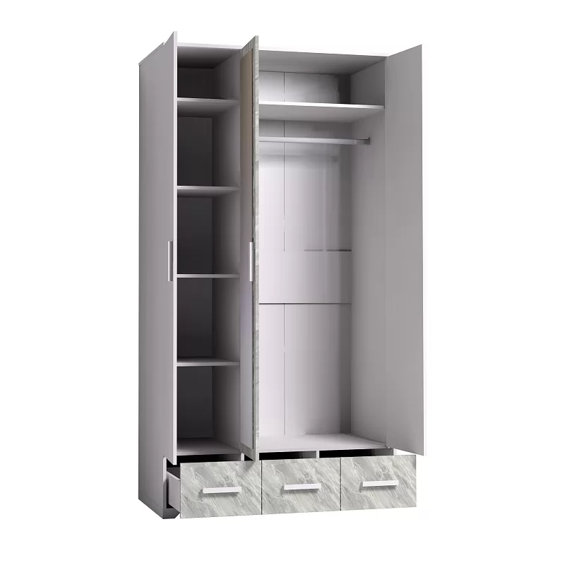 Трехстворчатый шкаф для одежды и белья Айрис 444 с зеркалом и выдвижными ящиками — находка для большой и маленькой спальни. Функциональное наполнение шкафа разделено, что очень удобно для зонирования гардероба всех членов семьи. Шкаф оснащен отделением для хранения белья с полками на скрытых полкодержателях и отделением для одежды со стационарной штангой 758 мм. 3 выдвижных ящика комплектуются шариковыми направляющими, что обеспечивает минимальный люфт ящиков и максимальное использование их площади. Петли с доводчиками для бесшумного закрывания дверок шкафа. Зеркало на фасаде шкафа.