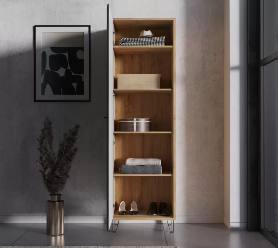 Шкаф-пенал имеет простую, но вместительную конструкцию. За распашной дверкой с металлической ручкой расположены глубокие полки. Внутри вы можете расположить большой перечень вещей: от головных уборов и одежды в стопках до обуви и дамских сумочек.