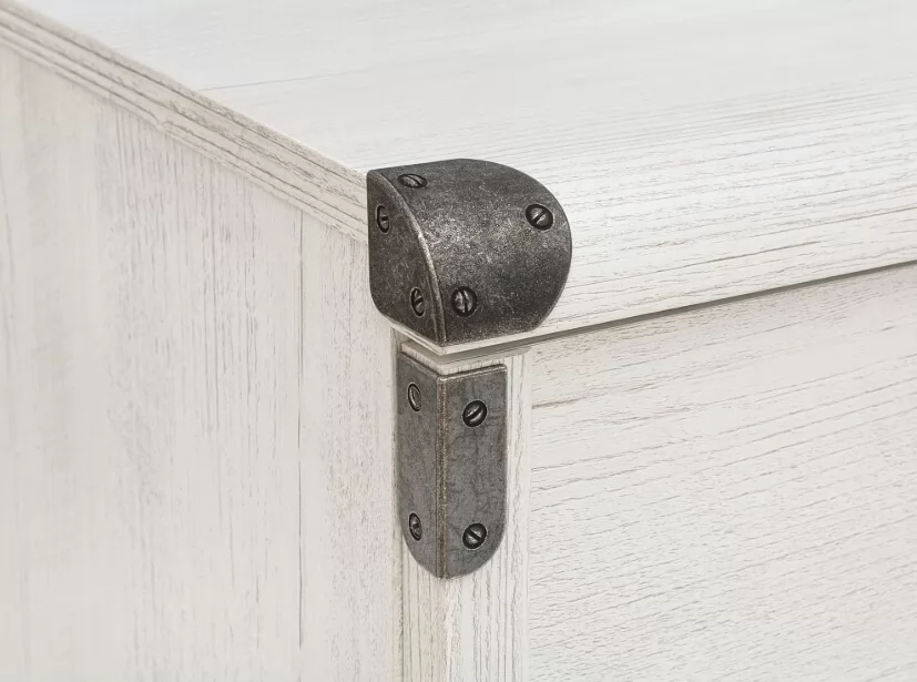 Шкаф выполнен в цвете «Сосна каньон», который воссоздаёт естественную текстуру древесины с мягкими золотистыми прожилками. Матовая поверхность фасадов из ЛДСП и МДФ устойчива к царапинам и сохраняет безупречный вид даже при активном использовании. Декоративные металлические ручки в виде скоб и угловые накладки добавляют нотку деревенского шарма, гармонично вписываясь в интерьеры в стиле кантри, классика или прованс.