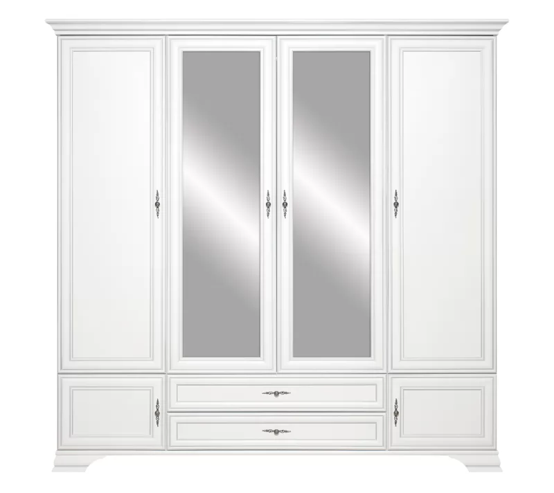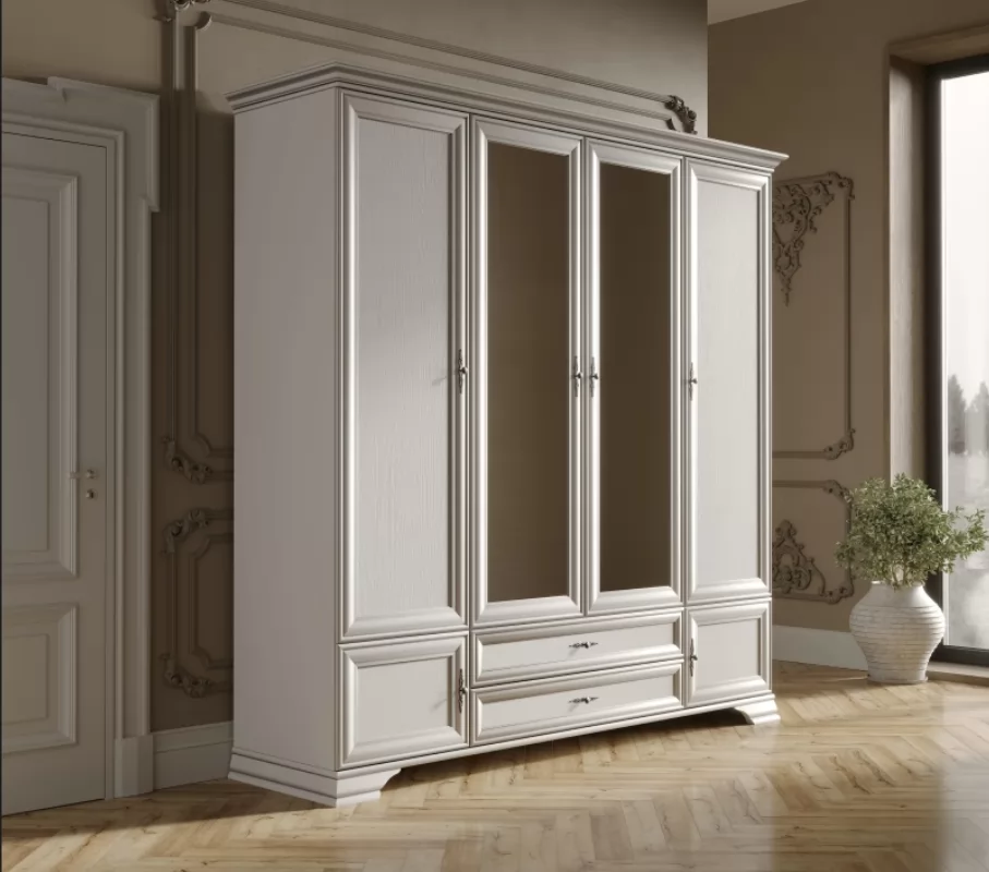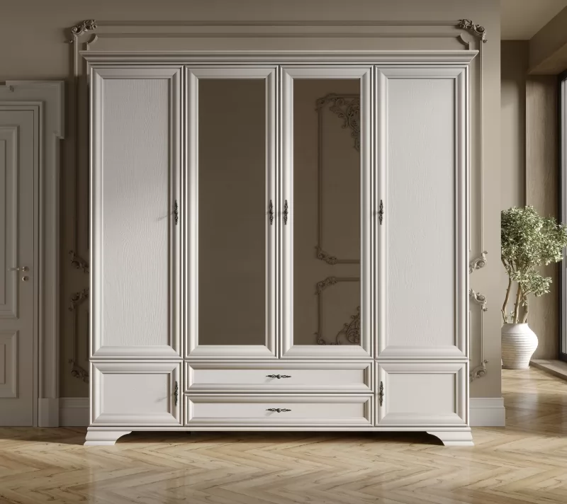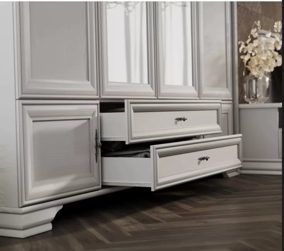 Центральные дверцы с зеркалами не только визуально расширяют пространство, но и позволяют удобно оценить свой внешний вид. Витиеватые ручки придают шкафу винтажный шарм, а прочные ножки из МДФ обеспечивают его стабильное расположение на полу.