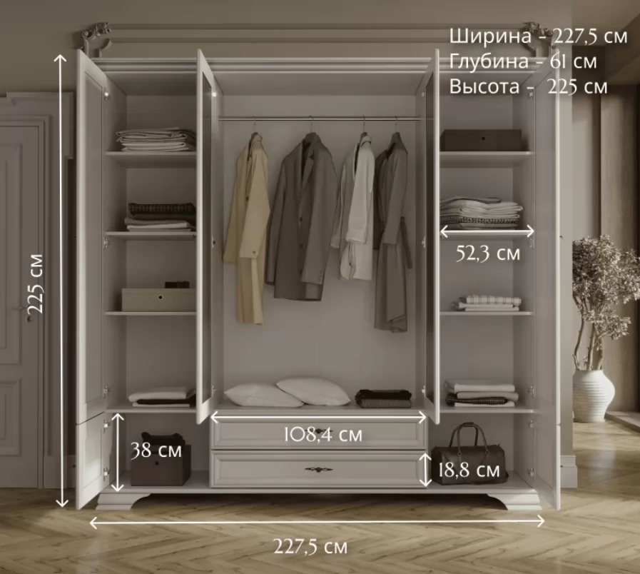 Шкаф имеет обширное внутреннее пространство. Он включает в себя просторный отсек со штангой, боковые полки и выдвижные ящики, что позволяет легко организовать гардероб, включая одежду на вешалках, головные уборы и обувь.