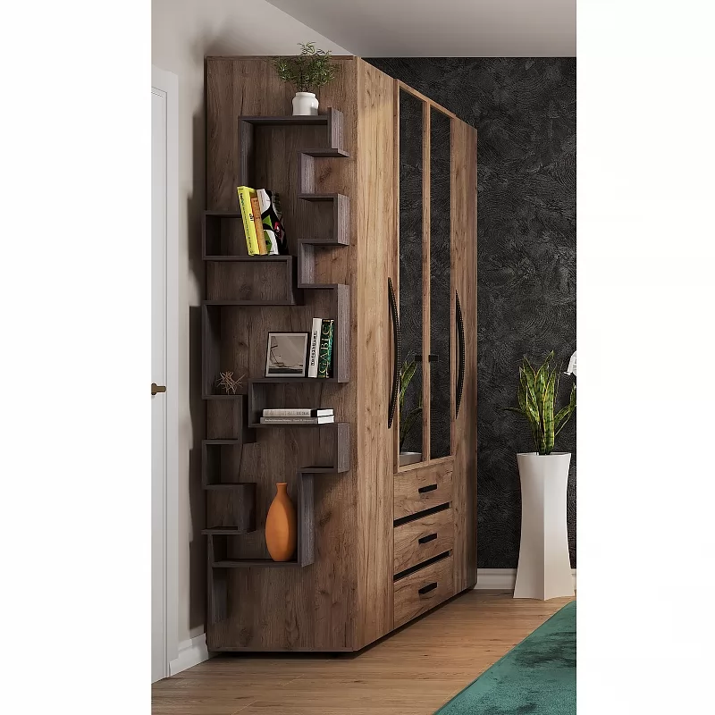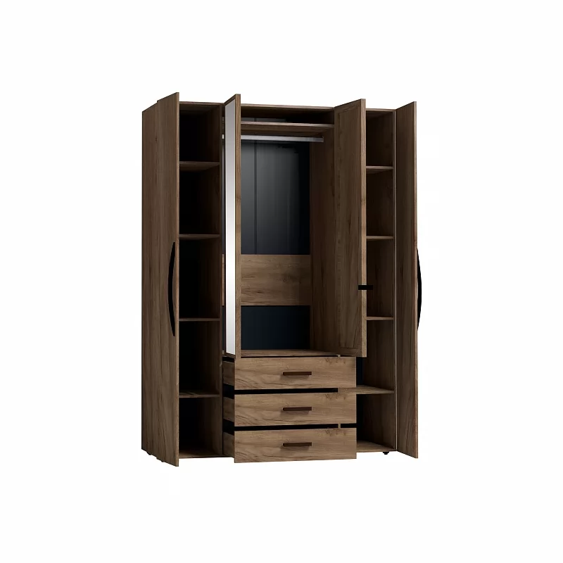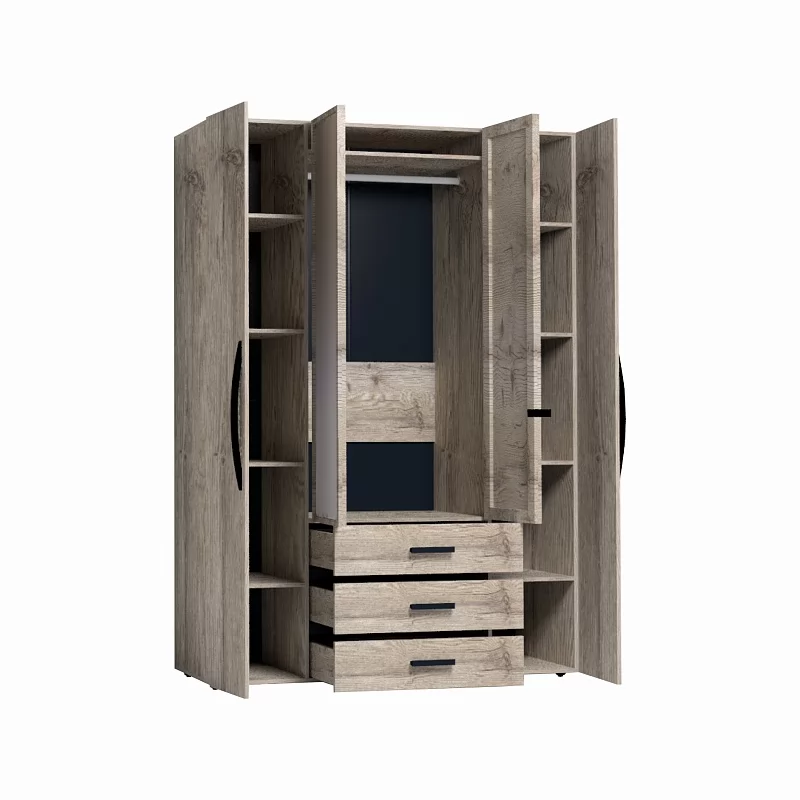 Вместительный распашной шкаф с двумя зеркальными фасадами прекрасно подойдет в современную спальню. Функциональное наполнение шкафа разделено на две симметричные половины, что очень удобно для пользования и зонирования гардероба всех членов семьи. За глухими фасадами скрываются отделения с 4 полочками, регулируемыми по высоте, что делает хранение одежды удобным. Зеркальные фасады шкафа обрамлены вставками из ЛДСП. Изнутри зеркало покрыто специальной защитной пленкой, которая предотвратит падение осколков, если оно разобьется. Элегантная ручка-петля позволит открывать дверцу, не прикасаясь к зеркальному полотну, а, значит, его не придется часто протирать. Вторая зеркальная дверца открывается за торец. Внутри шкафа закреплена стационарная штанга (777 мм), которая выдержит нагрузку 40 кг. Особенно деликатные вещи, постельные принадлежности и другие предметы быта помогут хранить три выкатных ящика глубиной 40 см. Ящики оснащены шариковыми направляющими полного выдвижения, что обеспечит их высокую прочность и абсолютную бесшумность при эксплуатации.