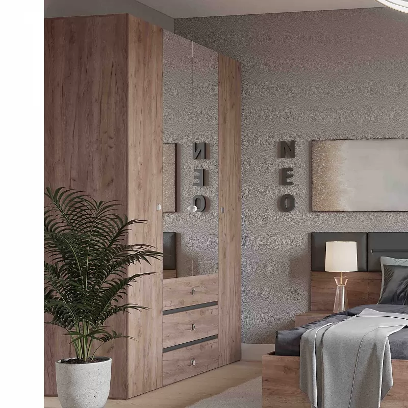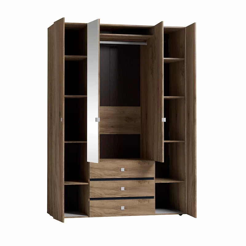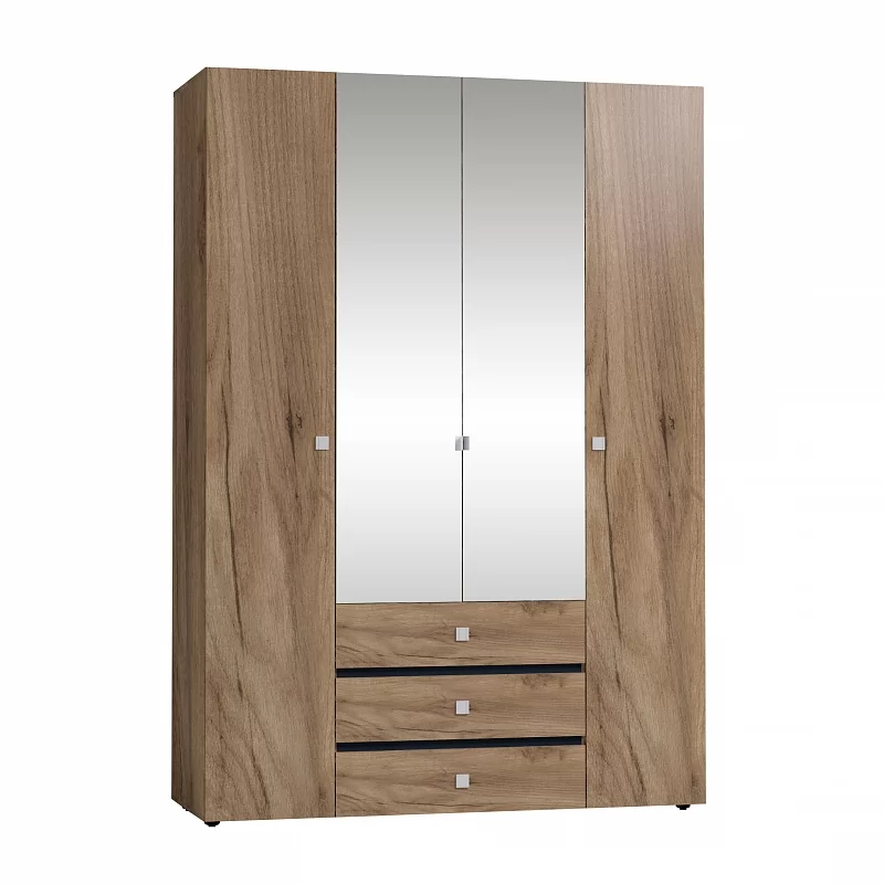 Вместительный распашной шкаф красивого древесного оттенка с черными вставками из ЛДСП и металлической фурнитурой, прекрасно подойдет в спальню в стиле лофт. Функциональное наполнение шкафа разделено на две симметричные половины, что очень удобно для пользования и зонирования гардероба всех членов семьи. За глухими фасадами скрываются отделения с 4 полочками, регулируемых по высоте, что делает хранение одежды и аксессуаров крайне удобным. За зеркальными фасадами шкафа закреплена стационарная штанга (777 мм), которая выдержит нагрузку в 40 кг. Изнутри зеркало покрыто специальной защитной пленкой, которая предотвратит падение осколков, если оно разобьется. Особенно деликатные вещи, постельные принадлежности и другие предметы быта помогут хранить три выкатных ящика с глубиной 40 см, высотой 14 см и шириной 75 см. Ящики оснащены шариковыми направляющими полного выдвижения, что обеспечит их высокую прочность и абсолютную бесшумность при эксплуатации.