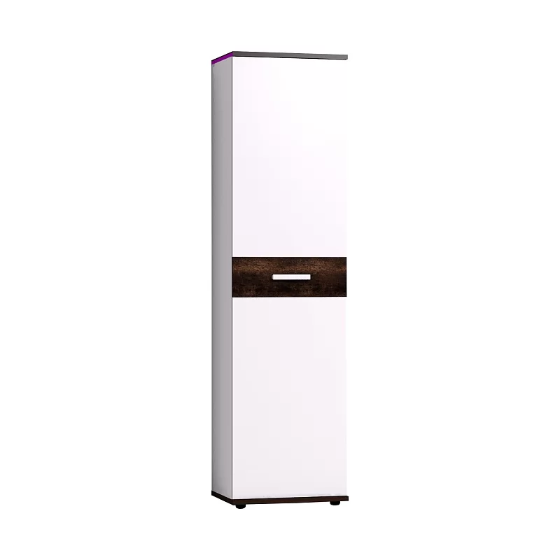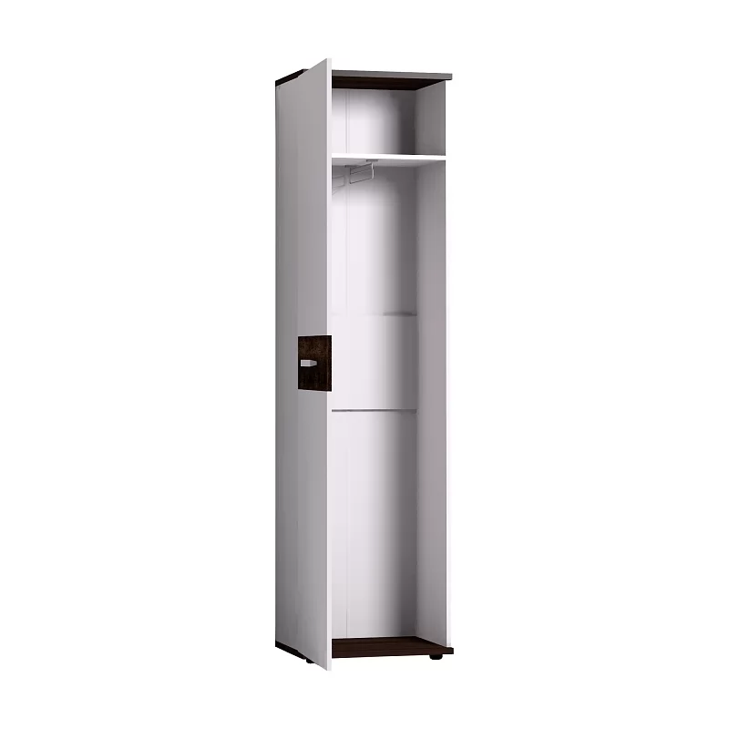 Распашной шкаф для одежды и белья комплектуется выдвижной штангой для одежды. Верхняя и нижняя детали шкафа толщиной 22 мм в декоре Орех Шоколадный и брашированная вставка - яркие акценты простого белого модуля. Ударопрочная кромка на фасаде толщиной 2 мм продлит срок эксплуатации мебели. Фасад шкафа перенавешивается на ваше усмотрение.