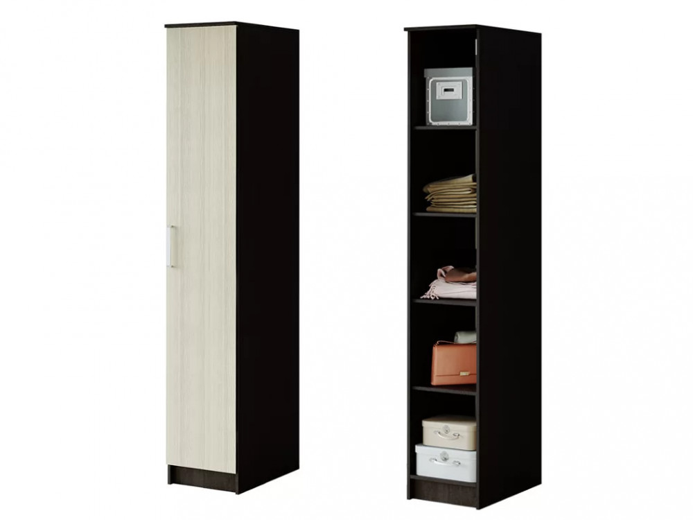 - модель представляет собой пять глубоких полок, спрятанных за распашной дверцей светлого цвета лоредо, - корпус изделия выполнен из ЛДСП в цвете венге, - фасад дополнен удобной удлинённой ручкой, - пенал комплектуется хромированной штангой и 4-мя полками.