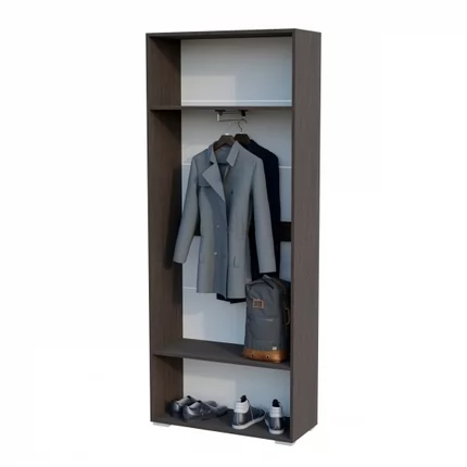 Шкаф оснащён одной антресольной полкой сверху, одной полкой внизу и штангой для вешалок.