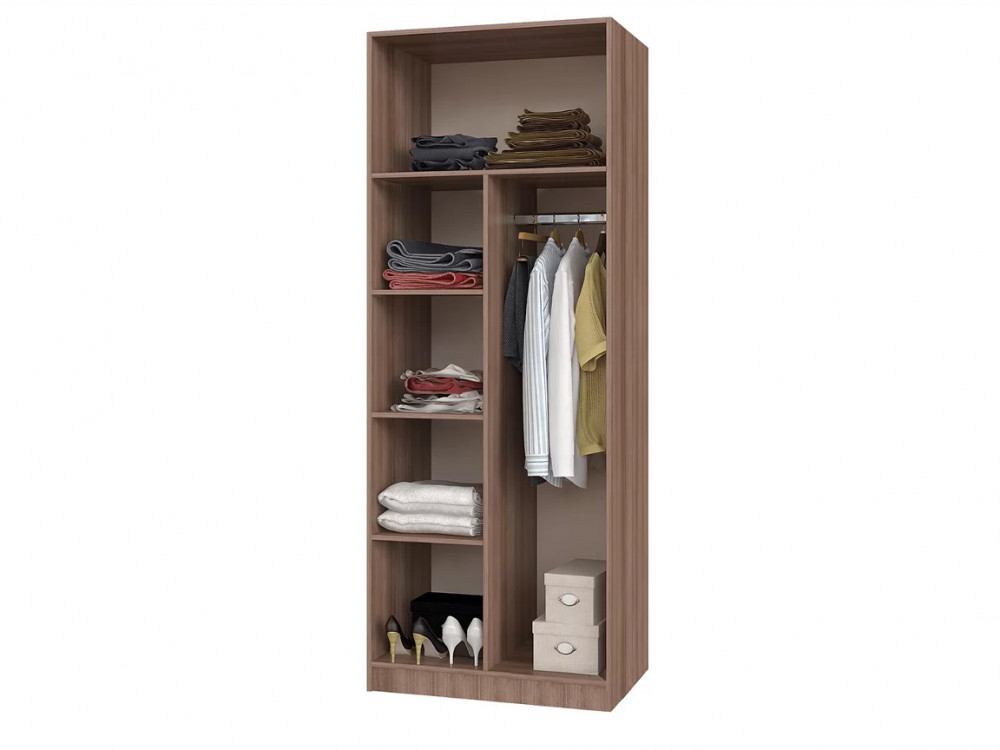 - модель разделена на две зоны, каждая из которых оснащена распашными дверцами, - в большей части находятся полки и отделение с хромированной штангой, - часть поменьше представляет собой вместительную нишу для хранения, - изделие выполнено из ЛДСП в комбинации контрастных цветов венге и лоредо.