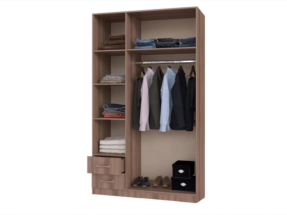- изделие состоит из нескольких зон для хранения одежды и обуви, включая два выдвижных ящика для мелких вещей, - отделение для одежды на вешалках и вместительные полки, - в центральную створку вставлено зеркало, что помимо основной функции, позволяет визуально расширить пространство, - сочетание тёмного корпуса и светлых фасадов позволит шкафу стать частью практически любого интерьера.