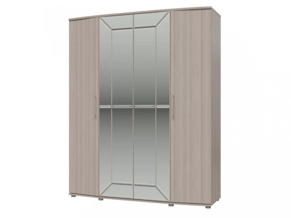 Шкаф с распашными дверями, с двух сторон отделение с тремя антресольными полками и горизонтальными штангами под ними. В центре шкаф украшают зеркала из 12-ти сегментов, внутри расположены антресольная полка, горизонтальная штанга и нижняя полка.