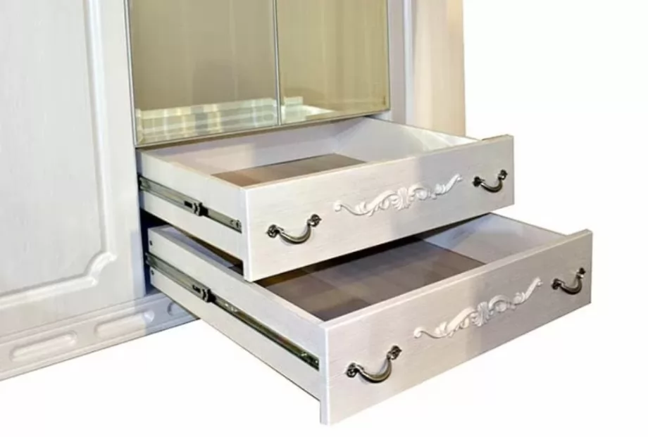 Ширина (мм): 1600 Высота (мм): 2300 Глубина (мм): 550 Цвет: Бодега белый Материал: МДФ/Зеркало Вес, кг: 180 Объем, м3: 0.31 Стиль: Классический Коллекция: Мария-Луиза Корпус — ЛДСП 16 мм Фасад — МДФ с фрезеровкой/Стекло с орнаментом Ручки металлические со стразами Петля с доводчиком Направляющие шариковые Кромка — ПВХ 0,45 мм