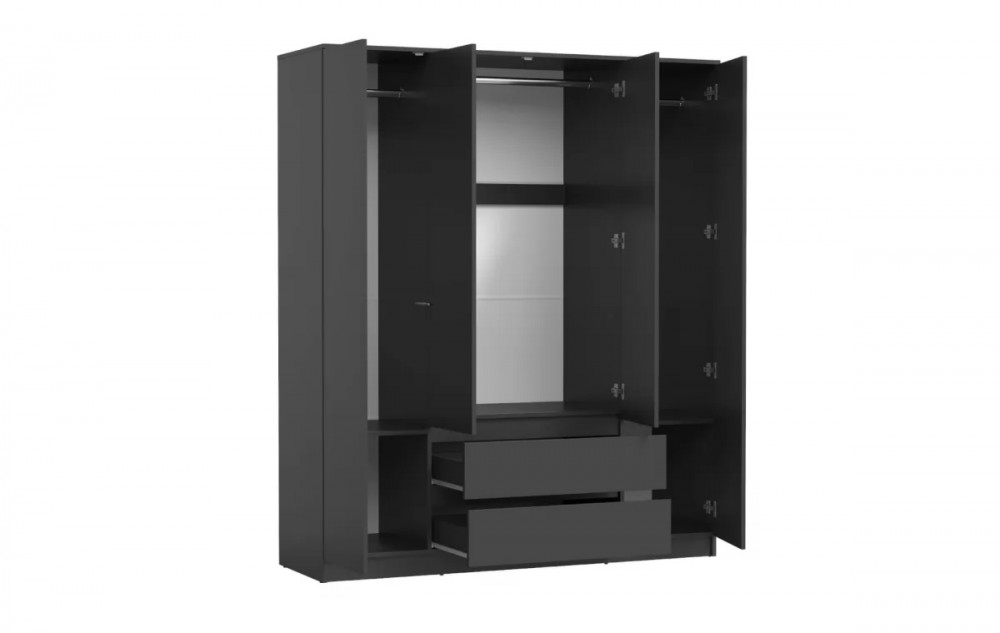 Конструкция позволяет организовать идеальное пространство для хранения вещей: одежда размещается на удобной штанге, мелочи аккуратно располагаются на полках, а аксессуары удобно хранятся в глубоких выдвижных ящиках.