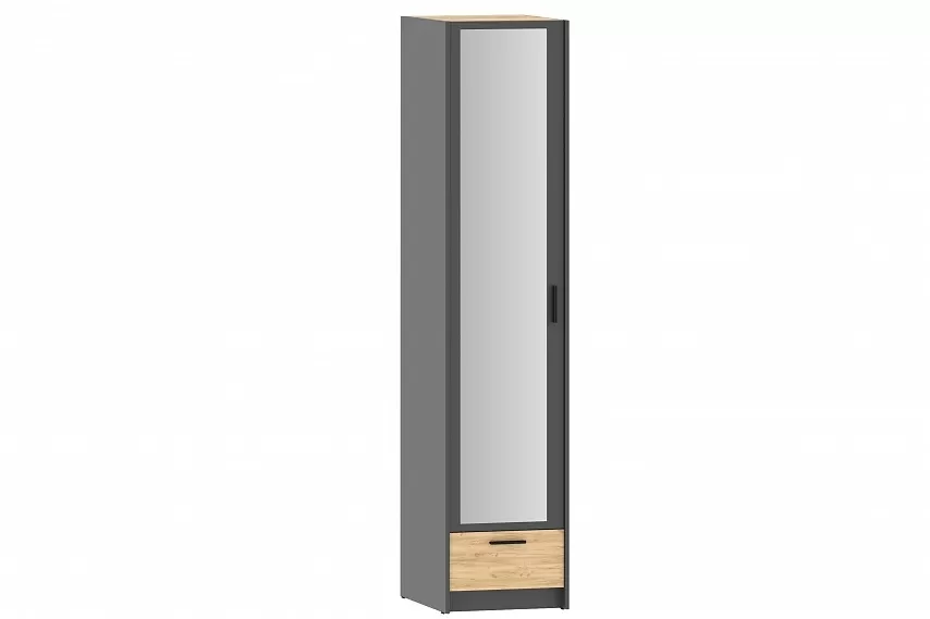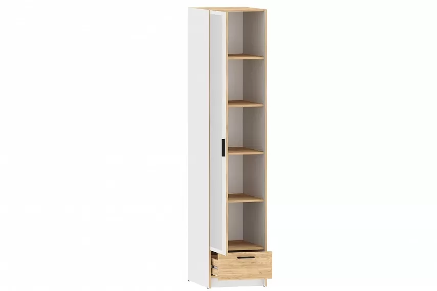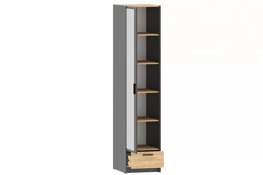Шкаф оснащен пятью полками для хранения вещей, а также выдвижным ящиком с шариковыми направляющими, за счет которых ящик выдвигается плавно и бесшумно. Шкаф является модульным, что позволяет комбинировать его с другими шкафами из одноименной коллекции. Лаконичный дизайн шкафа гармонично подчеркивается черными ручками. Сборка шкафа универсальна – дверь может крепиться как на правую, так и на левую стороны.