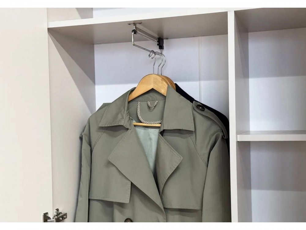 Шкаф оснащен накладными петлями с доводчиком от Боярд, которые обеспечивают плавное и бесшумное закрывание дверей. Выдвижная штанга и отделение с полками предоставляют удобный доступ к одежде, позволяя легко организовать внутреннее пространство.