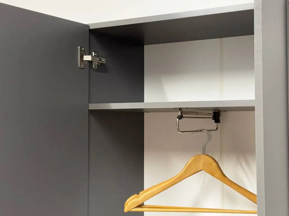 Шкаф оснащен накладными петлями с доводчиком от Боярд, которые обеспечивают плавное и бесшумное закрывание дверей. Выдвижная штанга предоставляет удобный доступ к одежде, позволяя легко организовать внутреннее пространство.