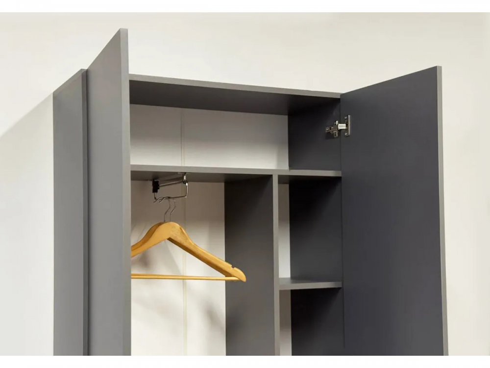 Шкаф оснащен накладными петлями с доводчиком от Боярд, которые обеспечивают плавное и бесшумное закрывание дверей. Выдвижная штанга и отделение с полками предоставляют удобный доступ к одежде, позволяя легко организовать внутреннее пространство.