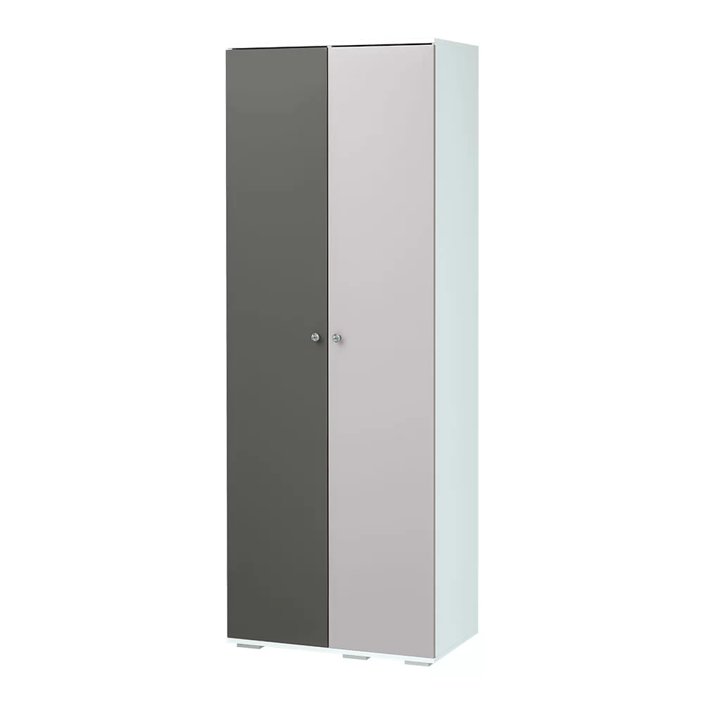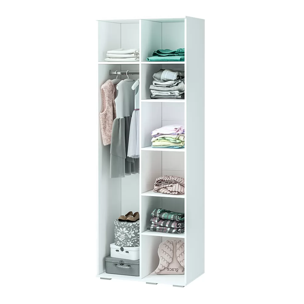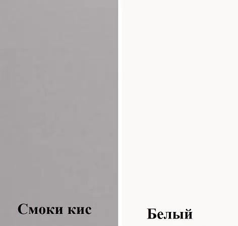 -модель из одноименной модульной серии выполнена из ЛДСП белого цвета, фасады – из МДФ в цветах смоки айс и смоки кисс, -створки дополнены ручками в виде хрусталя, -наполнение состоит из отделения для одежды на вешалках, а также нескольких полок.