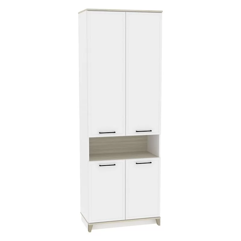 Ширина (мм): 800 Высота (мм): 2308 Глубина(мм): 450 Цвет корпуса: Белый-Блеквуд Сатиновый, Антрацит-Блеквуд Сатиновый Ручка-скоба металлическая (черный матовый) Петли: накладные Полки: регулируемые по высоте нагрузка на полку (кг): до 10 Материал корпуса: ЛДСП Материал фасада / вставок: ЛДСП