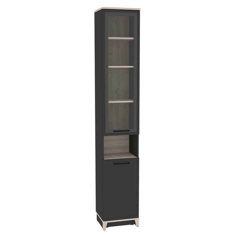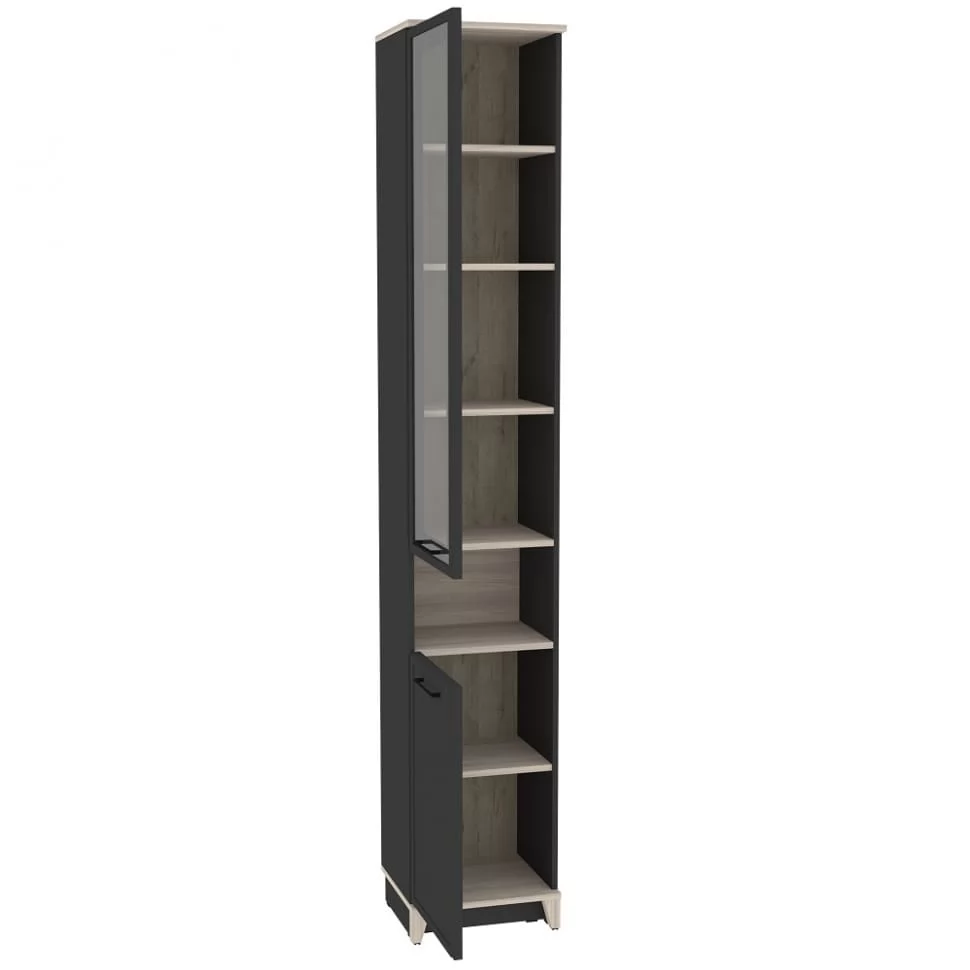 Ширина (мм): 400 Высота (мм): 2308 Глубина(мм): 355 Цвет корпуса: Белый-Блеквуд Сатиновый, Антрацит-Блеквуд Сатиновый Ручка-скоба металлическая (черный матовый) нагрузка на полку (кг): до 10 Материал корпуса: ЛДСП Материал фасада / вставок: ЛДСП,стекло