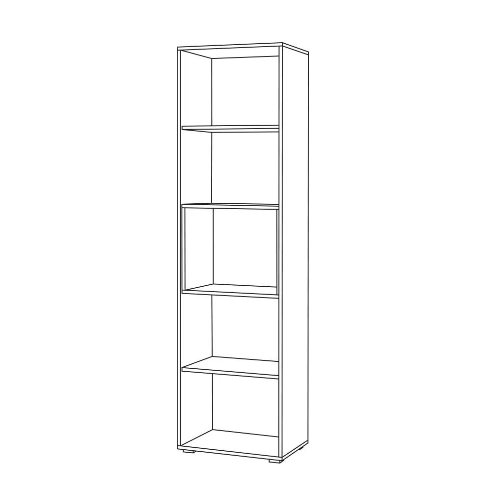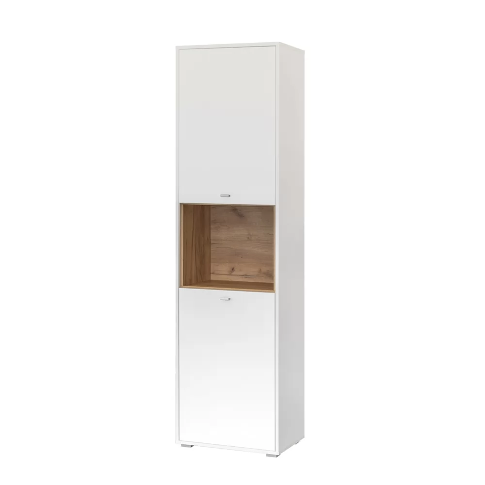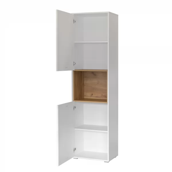 Шкаф-пенал из модульной серии "Бэль". Центральную часть шкафа занимает открытая ниша, верхнюю и нижнюю - закрытые ниши с полкой в каждой секции.