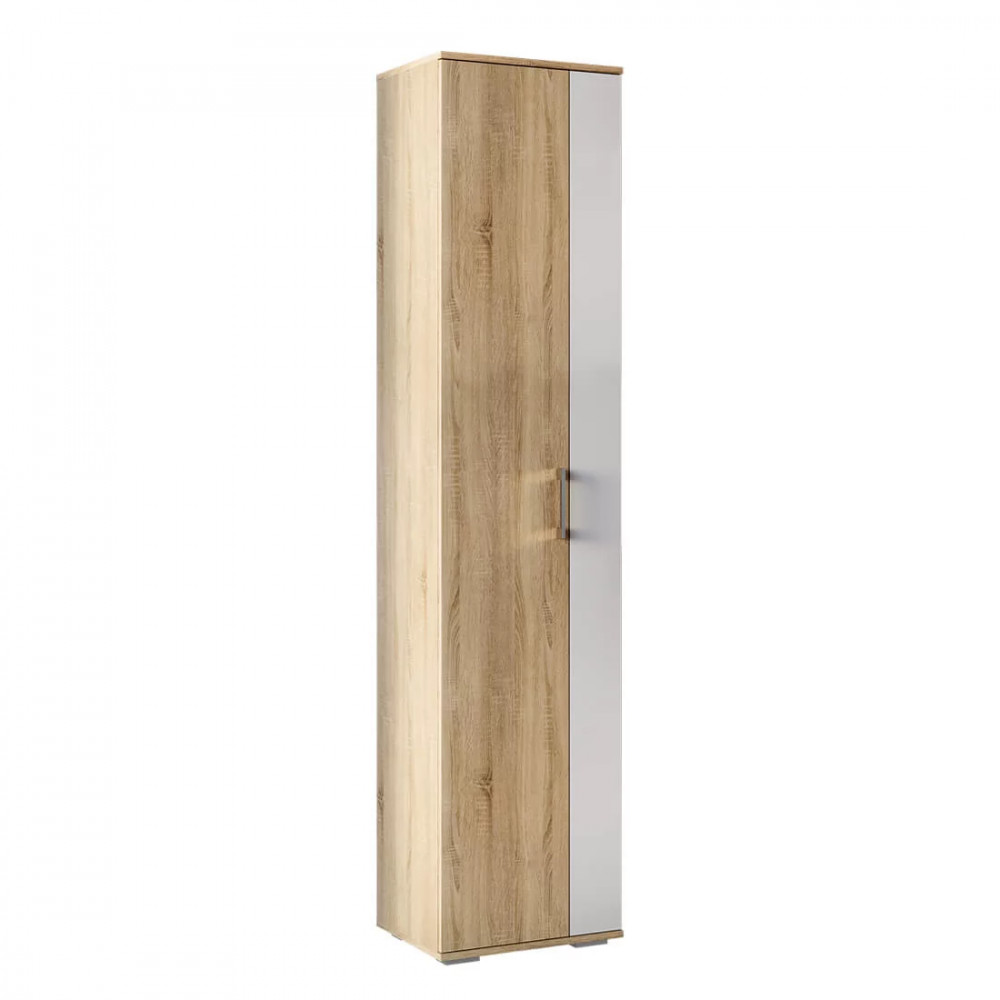 Модель может стать частью интерьера любой комнаты. Можно сочетать с другими модулями из одноименной мебельной серии. Наполнение шкафа представляет собой отделение с евроштангой и двумя вместительными полками. Фасад изделия выполнен из ЛДСП в комбинации белого цвета и цвета дуб сонома.