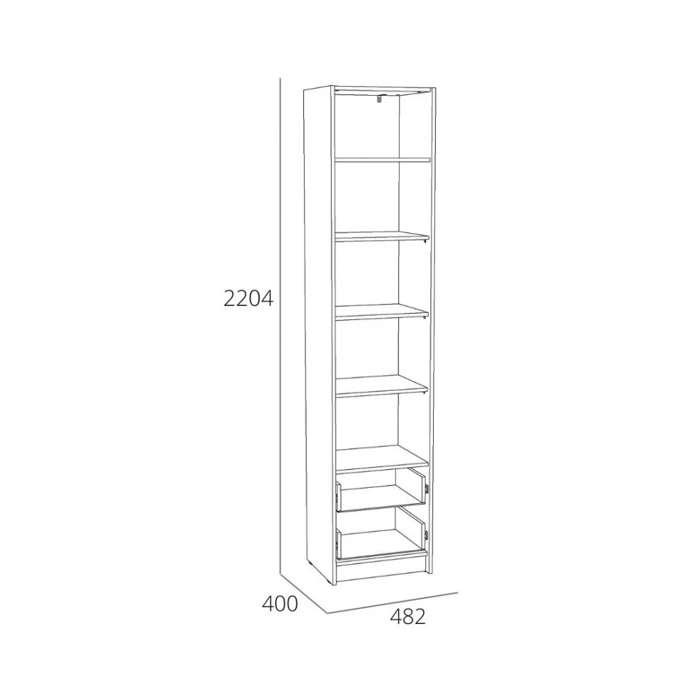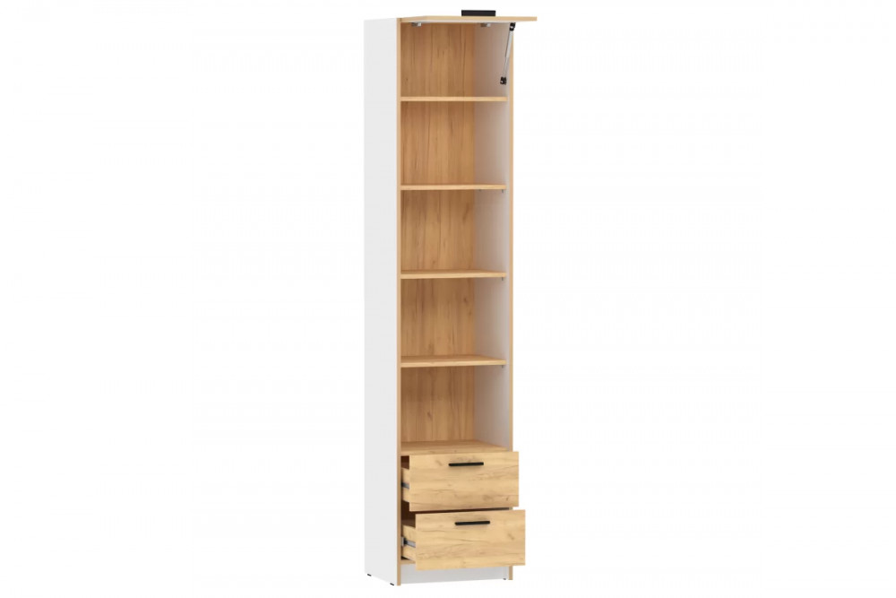 Шкаф оснащен полкой для хранения вещей, которая открывается с помощью газлифтов, которые которые фиксируют положение фасада в открытом виде, а также двумя выдвижными ящиками с шариковыми направляющими, за счет которых они выдвигаются плавно и бесшумно. Сочетание открытых и закрытых ниш добавляет легкости в интерьер, а также позволяет поместить красивую посуду или декор в видимой части изделия. Шкаф является модульным, что позволяет комбинировать его с другими шкафами и тумбами из одноименной коллекции. Лаконичный дизайн шкафа гармонично подчеркивается черными ручками.