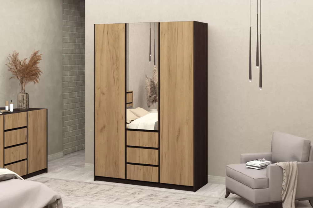 Стильный и современный дизайн шкафа. Шкаф имеет 2 отделения для размещения одежды на плечиках и отделение с полками. У шкафа есть 3 ящика на направляющих полного выдвижения (400 мм). Ширина (мм): 1500 Глубина (мм): 523 Высота (мм): 2200 Материал корпуса: ЛДСП Материал фасада: ЛДСП Кромка: ПВХ 0,4 мм Тип петли: накладная Зеркало: еврокромка Ручки: интегрированные Направляющие: шариковые Глубина ящиков: 400 мм Вес, кг: 145 Объем, м3 0,265 Количество упаковок: 3 Ориентация сборки: левая/правая Производство: г. Пенза Гарантийный срок: 24 месяца Срок службы: 10 лет