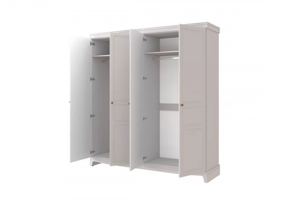 Глубина: 516 мм Ширина: 2046 мм Высота: 2185 мм Срок службы: 7 лет Гарантийный срок: 18 месяцев Монтаж: Требует сборки Фрезеровка фасада: Да Материал фасада: МДФ Материал корпуса: ЛДСП Материал полок: ЛДСП Вариант отделки фасада: Лакокрасочное покрытие Количество дверей: 4 шт Фурнитура: Петли с доводчиком Штанга для одежды: Шариковые направляющие полного выдвижения Коллекция: Спальня «Лорето» Льняной Цвет корпуса: Персидский жемчуг Цвет фасада: Льняной Материал ручек: Метал Цвет ручек: Золото